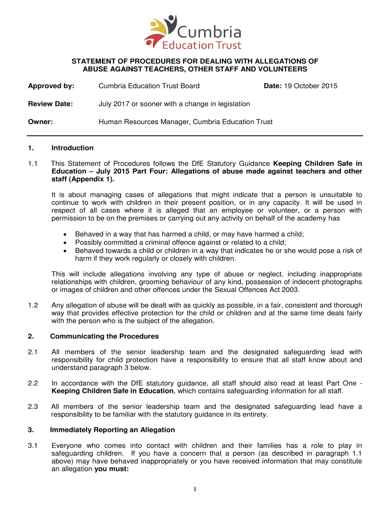 STATEMENT OF PROCEDURES FOR DEALING WITH ALLEGATIONS OF ABUSE AGAINST TEACHERS, OTHER STAFF AND VOLUNTEERS Approved by:Cambria Education Trust Boardwalk: 19 October 2015Review Date:July 2017 or sooner
