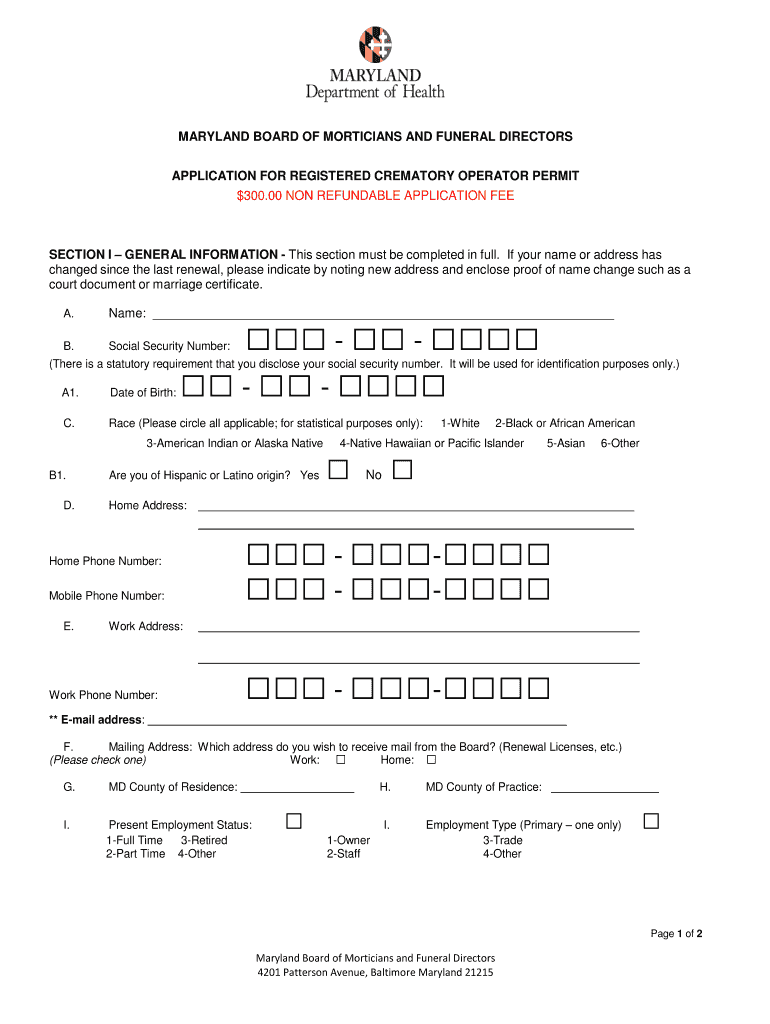 MARYLAND BOARD OF MORTICIANS AND FUNERAL DIRECTORS APPLICATION FOR REGISTERED CREMATORY OPERATOR PERMIT $300.00 NON-REFUNDABLE APPLICATION REELECTION I GENERAL INFORMATION This section must be completed
