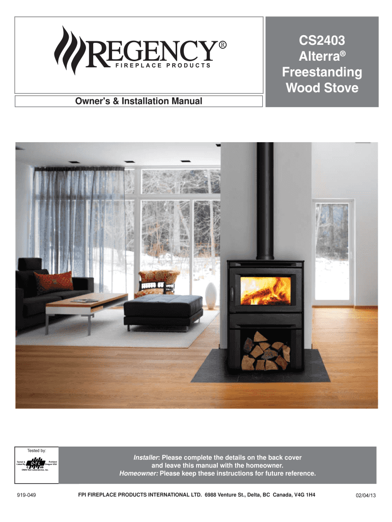 CS2403 Altered Freestanding Wood Stove Owner's & Installation ManualTested by:Installer: Please complete the details on the back cover and leave this manual with the homeowner. Homeowner: Please keep