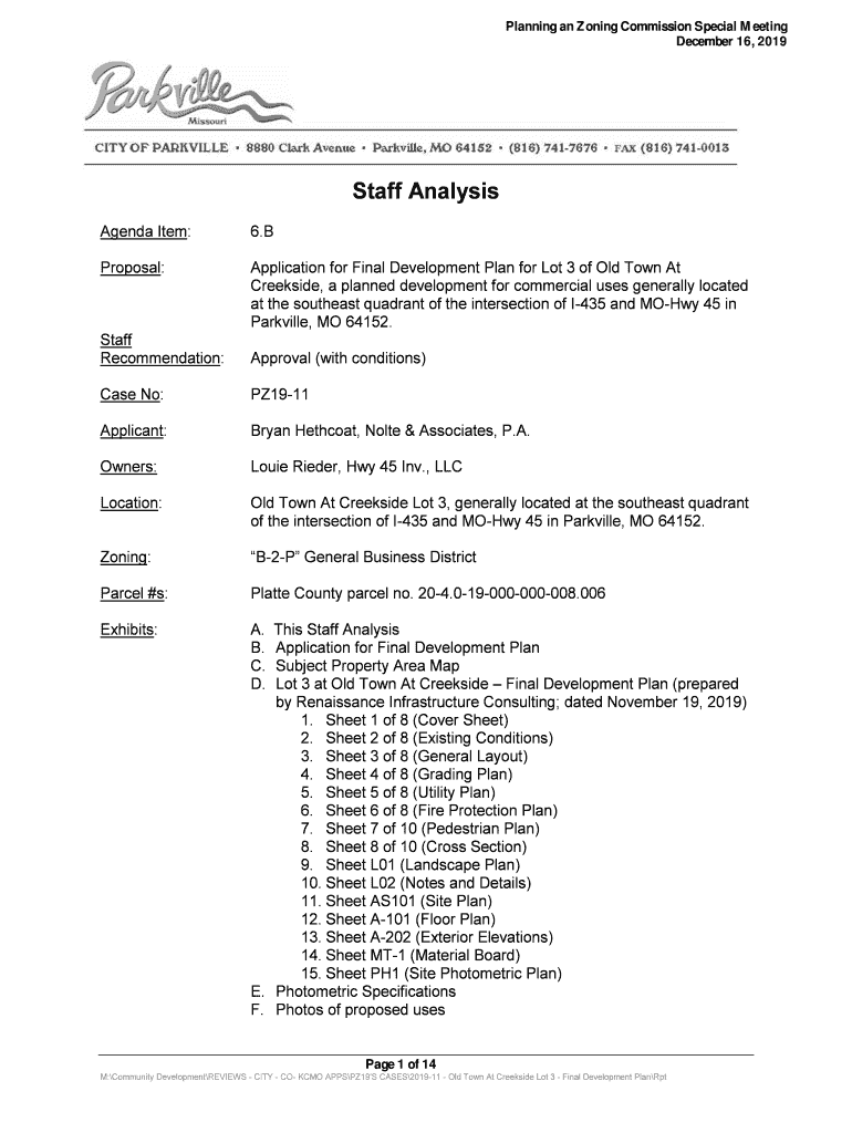 Planning a Zoning Commission Special Meeting December 16, 2019Staff Analysis Agenda Item:6. Proposal:Application for Final Development Plan for Lot 3 of Old Town At Creekside, a planned development