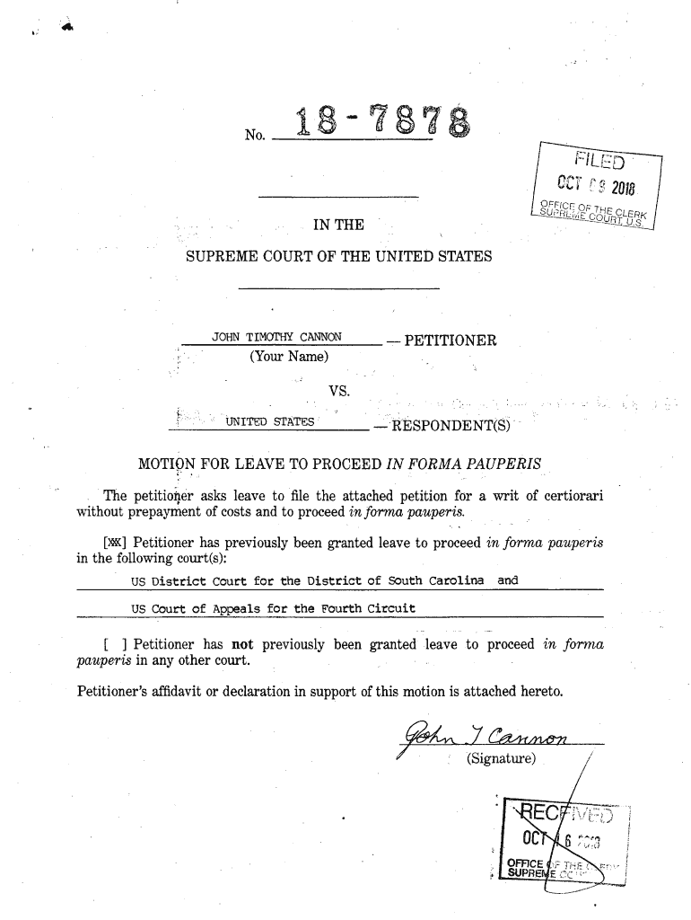 Elmo.CC2018OFFICE o T0,IN THE SUPREME COURT OF THE UNITED STATESMAN TIM(GPHY CANNON(Your Name)PETITIONERS. UNITED STATES:RESPONDENT()MOTION FOR LEAVE TO PROCEED IN FORM PAUPERS The petitioner asks