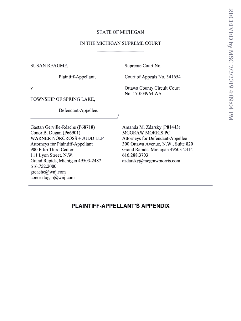 IN THE MICHIGAN SUPREME COURT SUSAN RESUME, Supreme Court No. PlaintiffAppellant, Court of Appeals No. 341654vOttawa County Circuit Court No. 17004964AATOWNSHIP OF SPRING LAKE, DefendantAppellee.