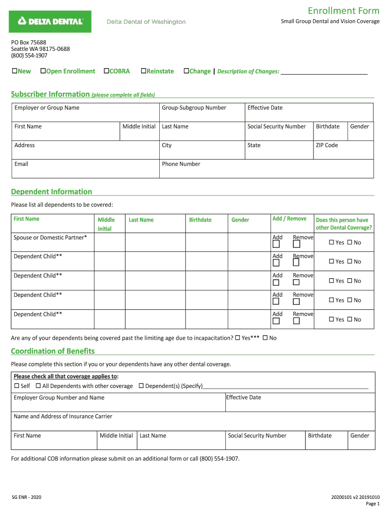 Enrollment Form Small Group Dental and Vision Coverage PO Box 75688 Seattle WA 981750688 (800) 5541907NewOpen EnrollmentCOBRAReinstateChange Description of Changes: Subscriber Information (please
