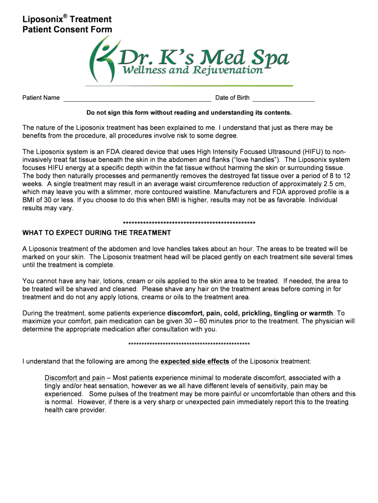 Liposonix treatment patient consent is a form that patients must sign to give their consent for undergoing liposonix treatment, which is a non-invasive fat reduction procedure.