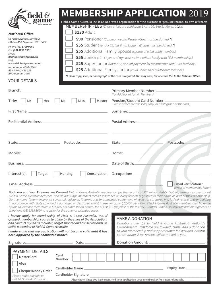 MEMBERSHIP APPLICATION 2019Field & Game Australia Inc. is an approved organization for the purpose of genuine reason to own a firearm. MEMBERSHIP FEES (These prices are valid from 1 April 2019 to