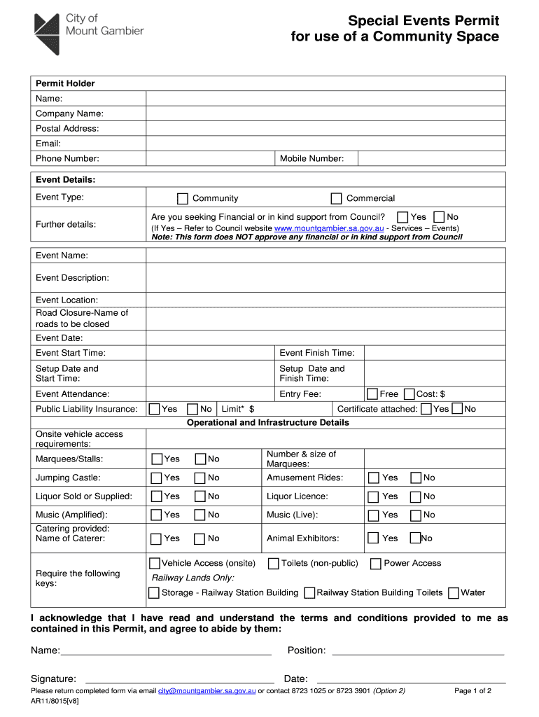 Special Events Permit for use of a Community Spaceport Holder Name: Company Name: Postal Address: Email: Phone Number:Mobile Number:Event Details:Event Type: Further details:CommunityCommercialAre