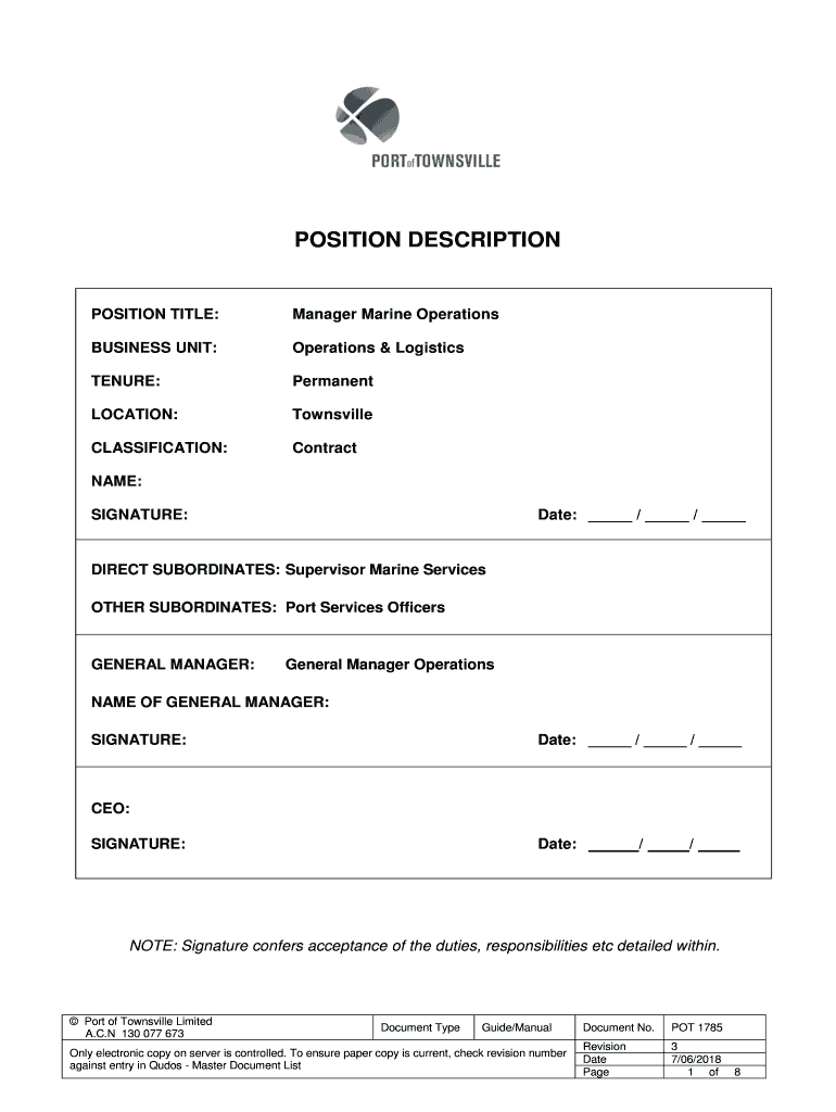 POSITION DESCRIPTIONPOSITION TITLE:Manager Marine OperationsBUSINESS UNIT:Operations & LogisticsTENURE:PermanentLOCATION:TownsvilleCLASSIFICATION:Contractual: SIGNATURE:Date: / / DIRECT SUBORDINATES:
