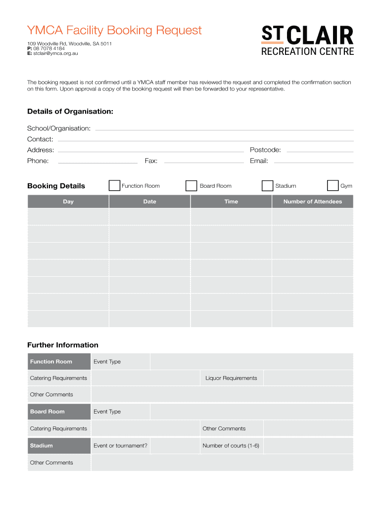 E: stclair@ymca.org.auThe booking request is not confirmed until a YMCA staff member has reviewed the request and completed