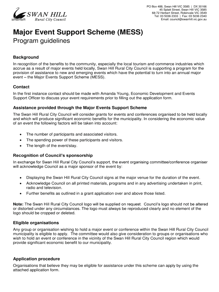 PO Box 488, Swan Hill VIC 3585 DX 30166 45 Splat Street, Swan Hill VIC 3585 6872 Herbert Street, Robin vale VIC 3549 Tel: 03 5036 2333 Fax: 03 5036 2340 Email: council swan hill.Vic.gov.major Event