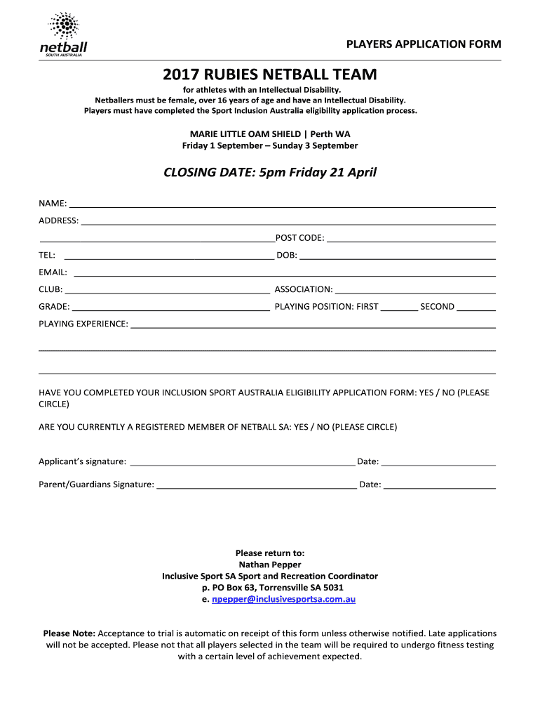 PLAYERS APPLICATION FORM2017 RUBIES NETBALL TEAM for athletes with an Intellectual Disability. Retailers must be female, over 16 years of age and have an Intellectual Disability. Players must have