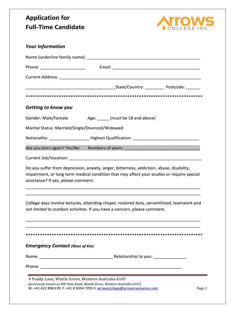 Application forFullTime CandidateYour Informational (underline family name): Phone: Email: Current Address: State/Country: Postcode: ***************************************************************************Getting