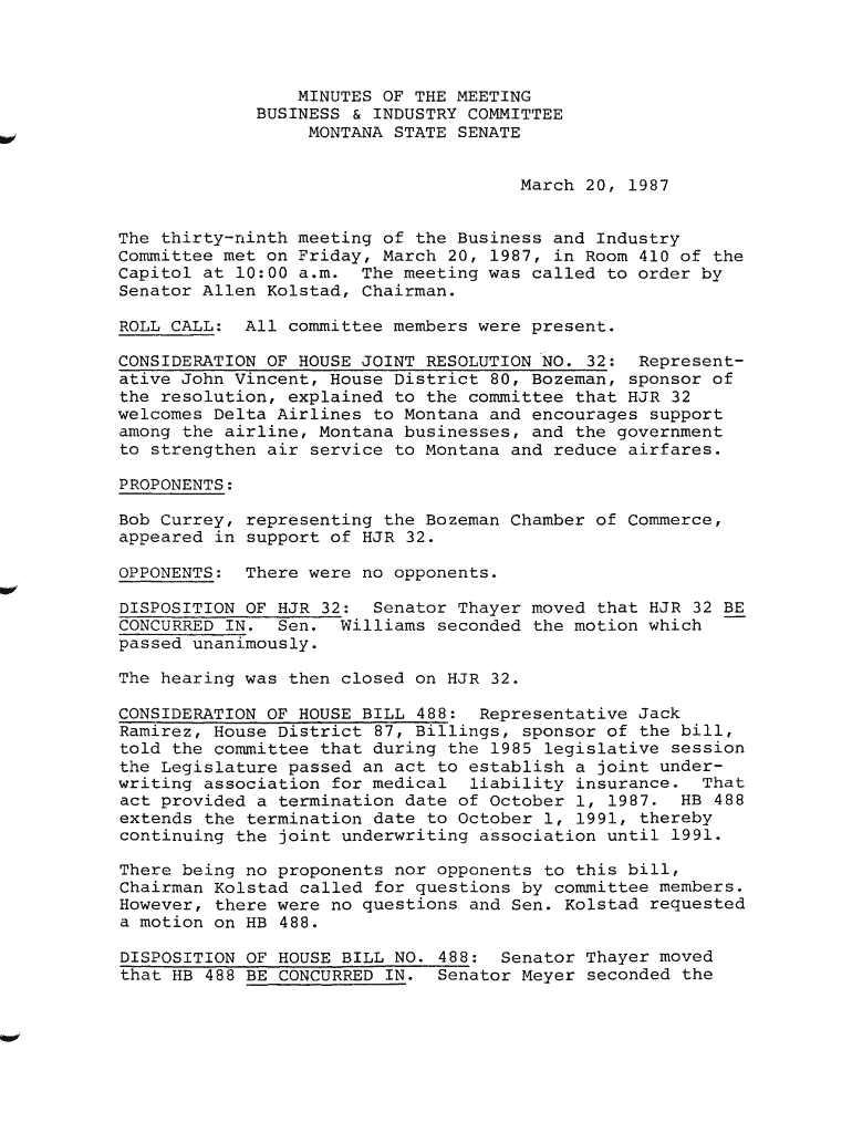 MINUTES OF THE MEETING BUSINESS & INDUSTRY COMMITTEE MONTANA STATE SENATE March 20, 1987, The thirty-ninth meeting of the Business and Industry Committee met on Friday, March 20, 1987, in Room 410
