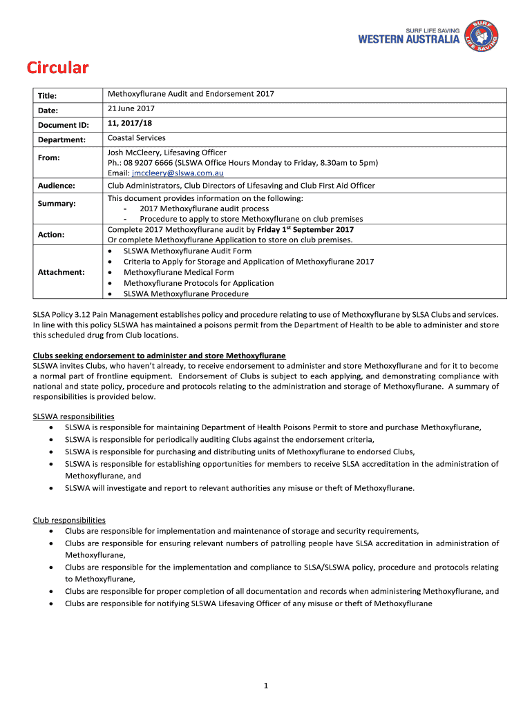 Title:Methoxyflurane Audit and Endorsement 2017Date:21 June 2017Document ID:11, 2017/18Department:Coastal ServicesFrom: