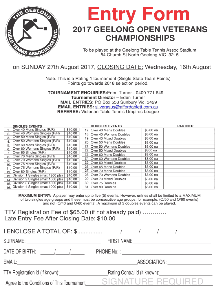 Entry Form 2017 GEELONG OPEN VETERANS CHAMPIONSHIPS To be played at the Geelong Table Tennis Assoc Stadium 84 Church St North Geelong VIC. 3215on SUNDAY 27th August 2017, CLOSING DATE: Wednesday,