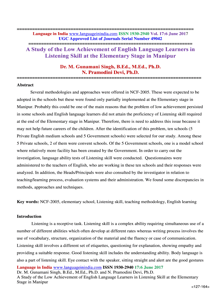 Language in India www.languageinindia.com ISSN 19302940 Vol. 17:6 June 2017 UGC Approved List of Journals Serial Number 49042 A Study of the Low Achievement of English Language Learners in Listening