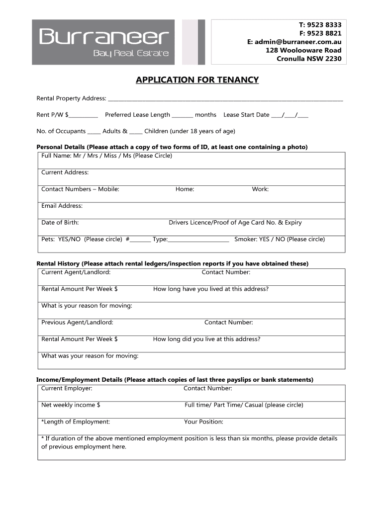 T: 9523 8333 F: 9523 8821 E: admin burraneer.com.AU 128 Wholewheat Road Cornell NSW 2230APPLICATION FOR TENANCY Rental Property Address: Rent P/W $ Preferred Lease Length monthsLease Start Date /