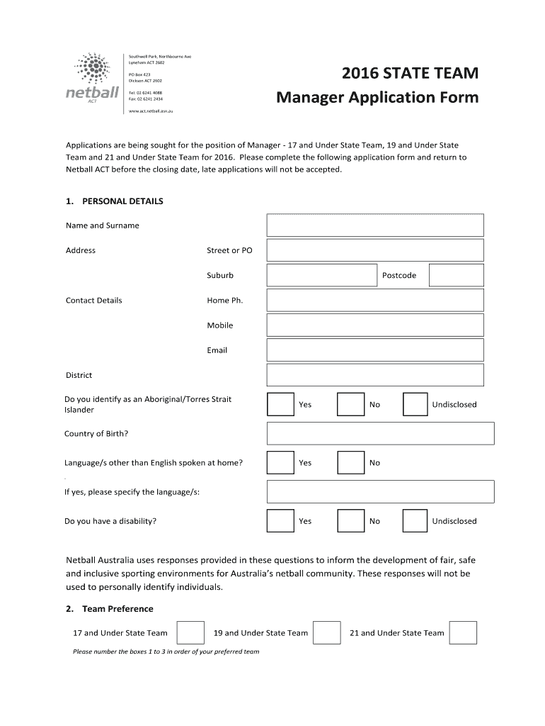 South well Park, Northbound Ave Langham ACT 26022016 STATE TEAM Manager Application Form PO Box 423 Dickson ACT 2602 Tel: 02 6241 4088 Fax: 02 6241 2434 www.act.netball.asn.auApplications are being