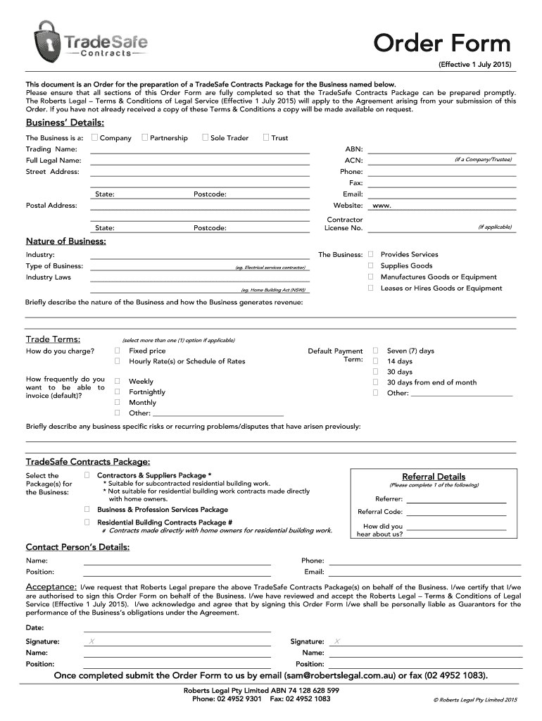 Order Form (Effective 1 July 2015) This document is an Order for the preparation of a Trademark Contracts Package for the Business named below. Please ensure that all sections of this Order Form are
