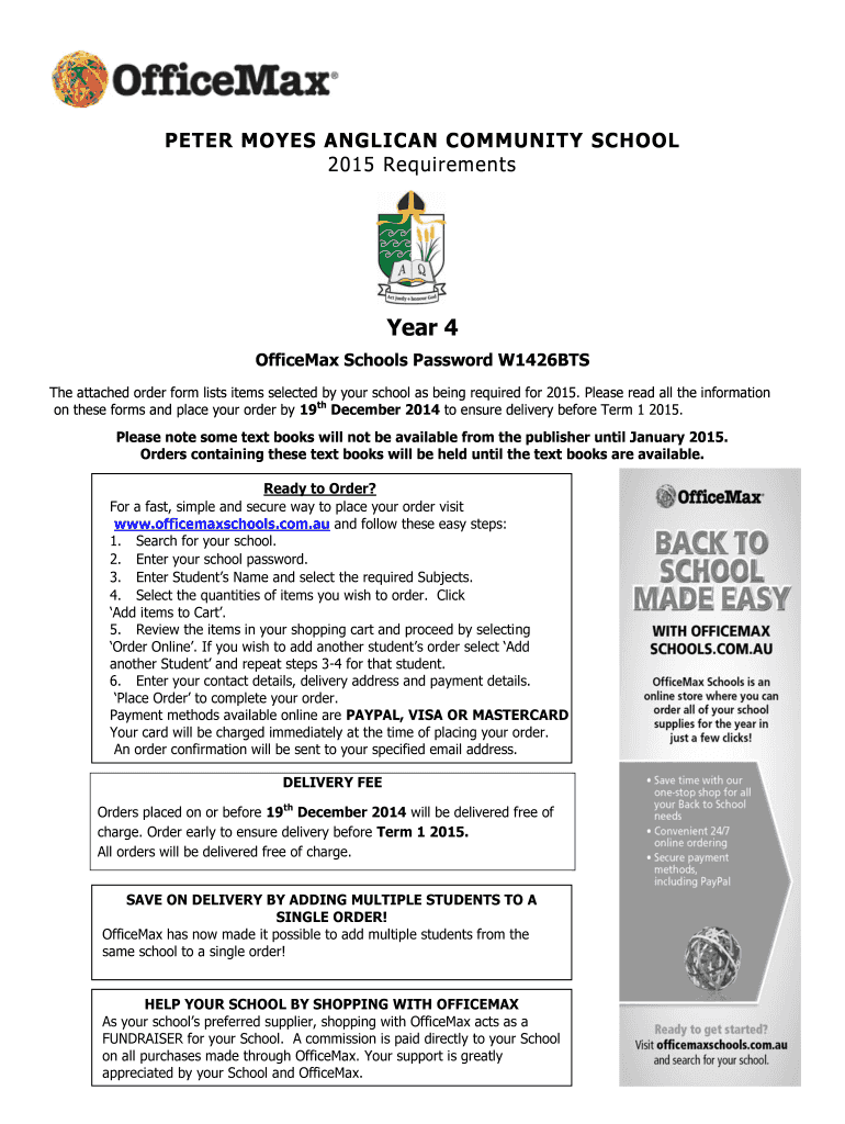 The attached order form lists items selected by your school as being required for 2015. Please read
