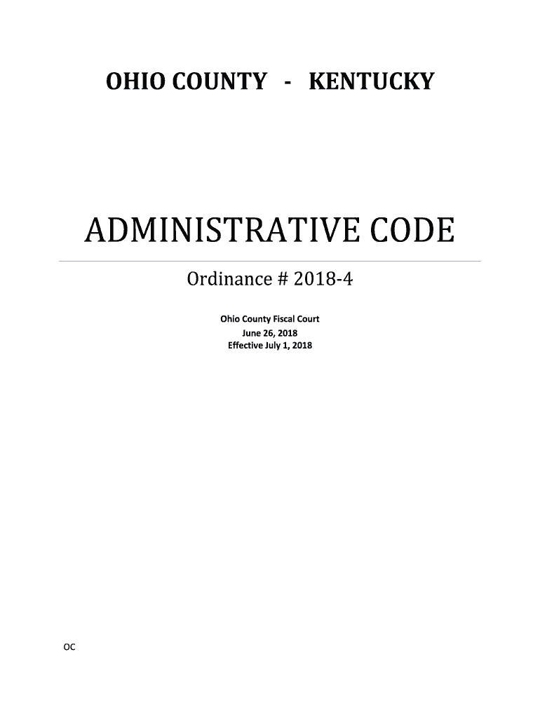 OHIO COUNTY KENTUCKYADMINISTRATIVE CODE Ordinance # 20184 Ohio County Fiscal Court June 26, 2018, Effective July 1, 2018OC1Commonwealth of Kentucky Ohio County Fiscal Court ORDINANCE #20184AN ORDINANCE
