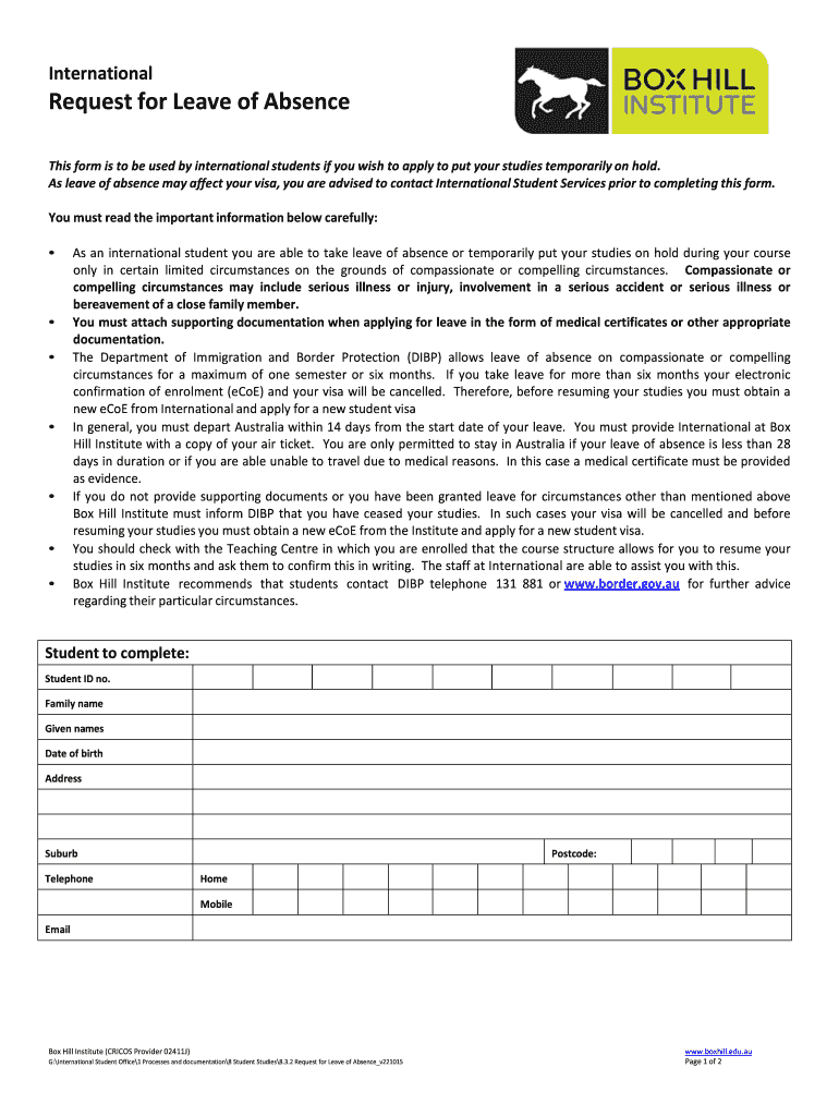 InternationalRequest for Leave of Absences form is to be used by international students if you wish to apply to put your studies temporarily on hold. As leave of absence may affect your visa, you