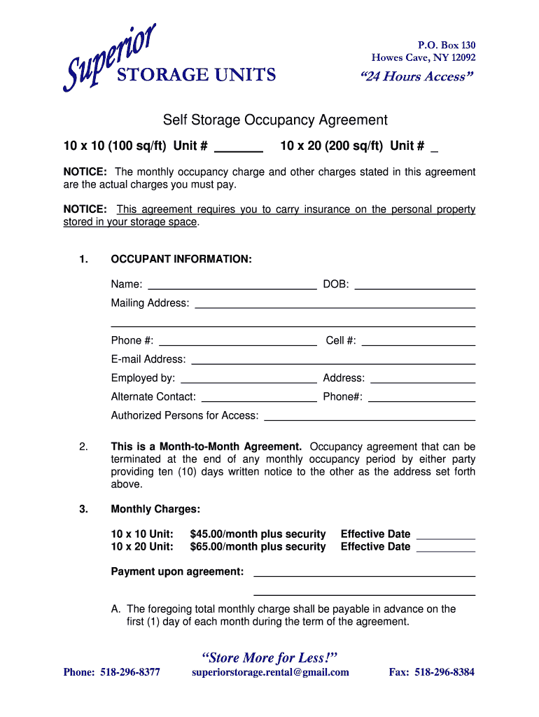 P.O. Box 130 Howe's Cave, NY 12092STORAGE UNITS24 Hours Accessible Storage Occupancy Agreement 10 × 10 (100 sq/ft) Unit # 10 × 20 (200 sq/ft) Unit # NOTICE: The monthly occupancy charge and other