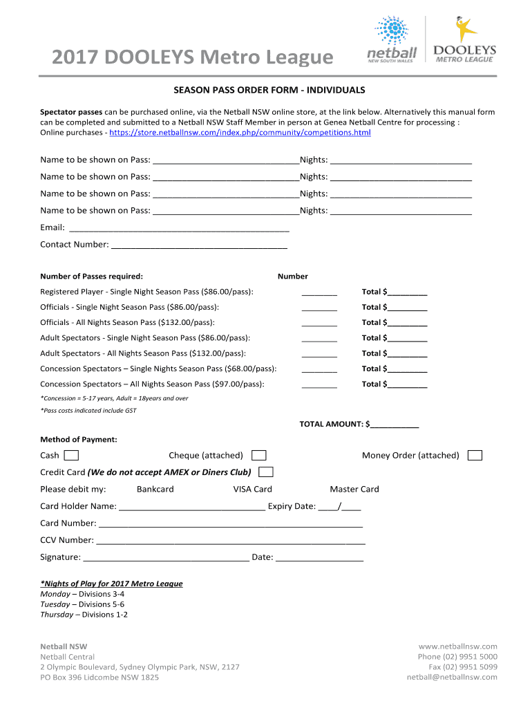 2017 DOOLEY Metro League SEASON PASS ORDER FORM INDIVIDUALS Spectator passes can be purchased online, via the Netball NSW online store, at the link below. Alternatively this manual form can be completed