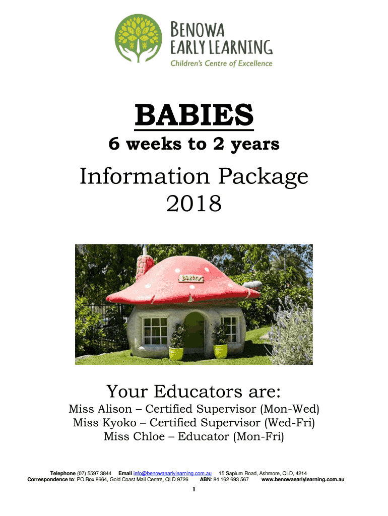 BABIES 6 weeks to 2 misinformation Package 2018Your Educators are: Miss Alison Certified Supervisor (Mowed) Miss Kyoto Certified Supervisor (Wed Fri) Miss Chloe Educator (Mon Fri) Telephone (07) 5597