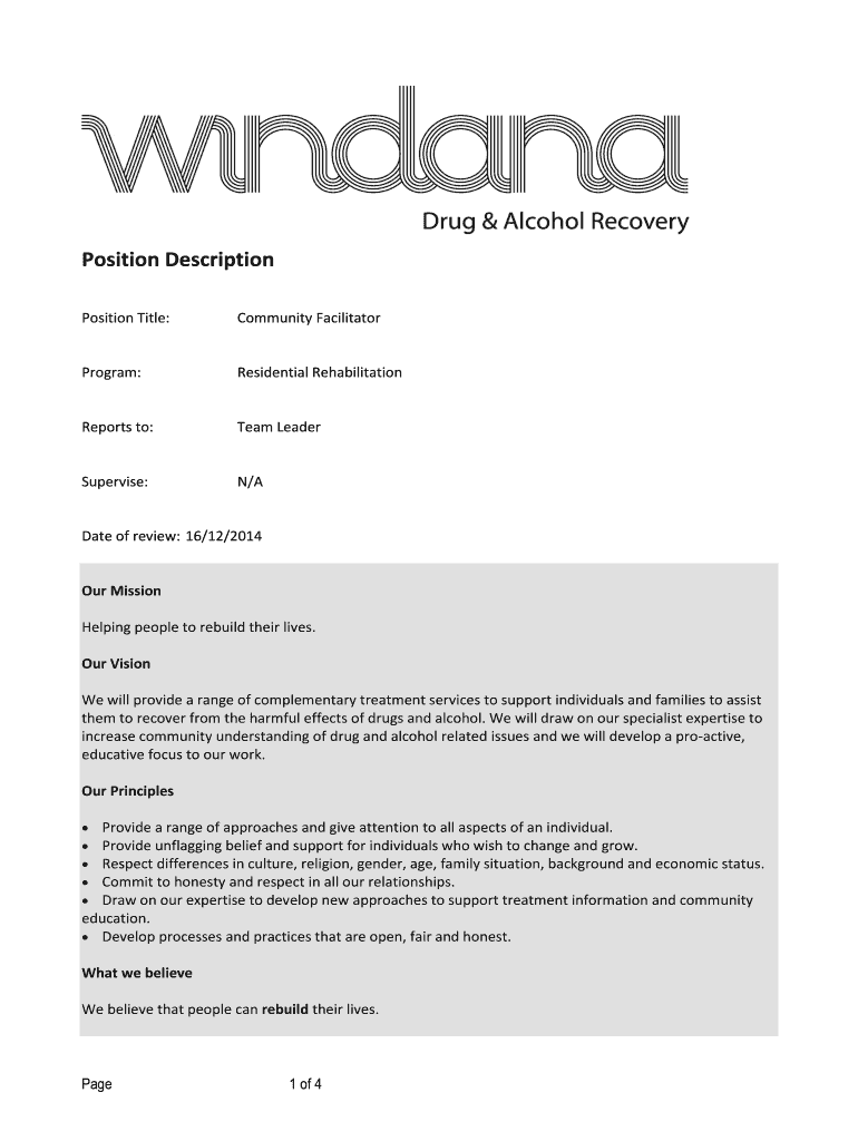 Position Title:Community FacilitatorProgram:Residential RehabilitationReports to:Team LeaderSupervise:N/Date of review: 16/12/2014Our Mission