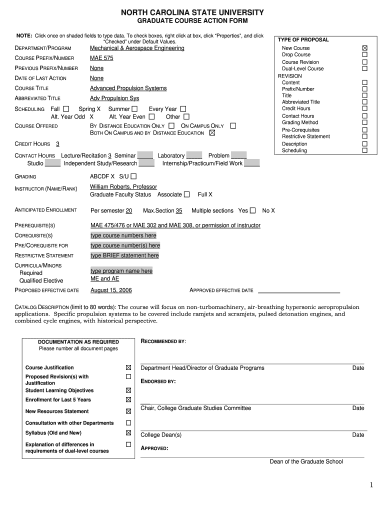NORTH CAROLINA STATE UNIVERSITY GRADUATE COURSE ACTION FORM NOTE: Click once on shaded fields to type data. To check boxes, right click at box, click Properties, and click Checked under Default Values.DEPARTMENT/PROGRAMMechanical