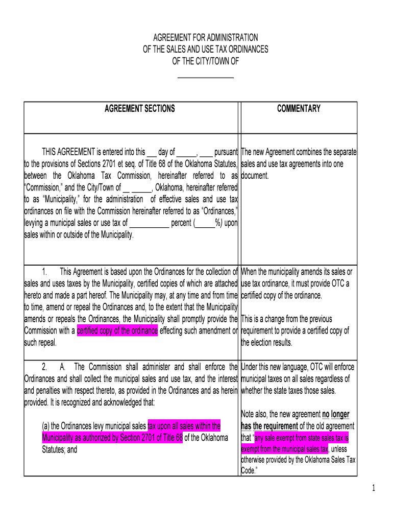 AGREEMENT FOR ADMINISTRATION OF THE SALES AND USE TAX ORDINANCES OF THE CITY/TOWN OF AGREEMENT SECTIONSCOMMENTARYTHIS AGREEMENT is entered into this day of, pursuant The new Agreement combines the