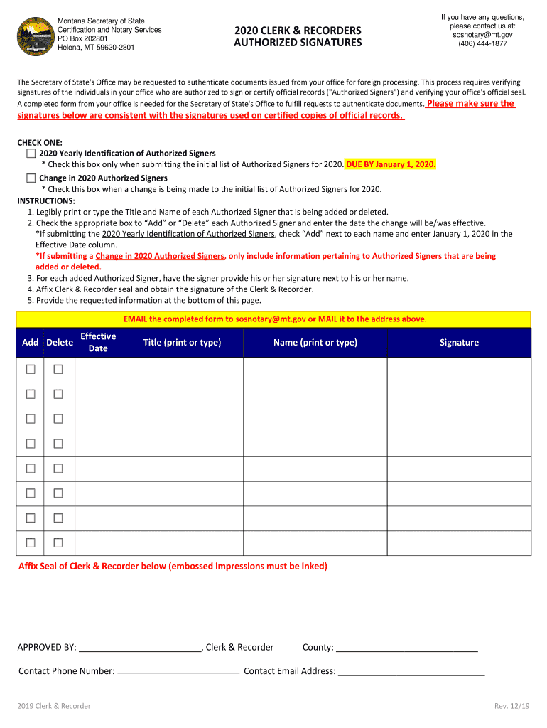 Montana Secretary of State Certification and Notary Services PO Box 202801 Helena, MT 5962028012020 CLERK & RECORDERS AUTHORIZED Signatures you have any questions, please contact us at: honorary CT.gov