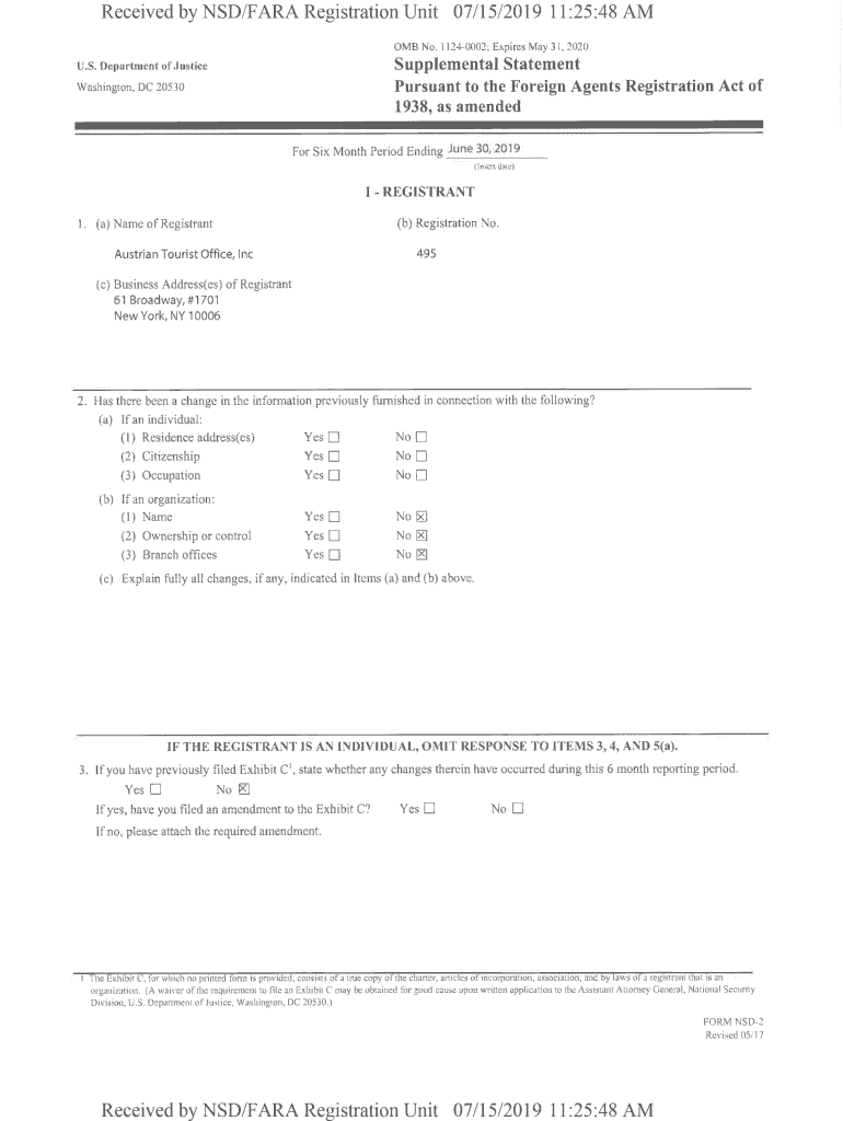 Received by NSW/FAR Registration Unit 07/15/2019 11:25:48 AM OMB No. 11240002; Expires May 31,2020Supplemental Statement Pursuant to the Foreign Agents Registration Act of 1938, as amended. S. Department