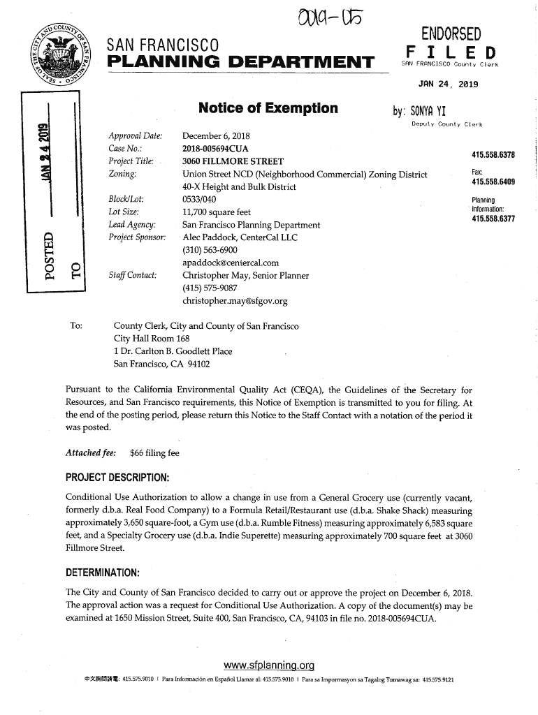 COU(2,w SAN FRANCISCO a PLAN N I NG DEPARTMENTENaREQ F I L E MSRN FRANCISCO County ClerkOlb3, SS 0, 5JAN 24, 2019Notice of ExemptionDeputy County ClerksApproval Date: Case No.: Project Title: Zoning: