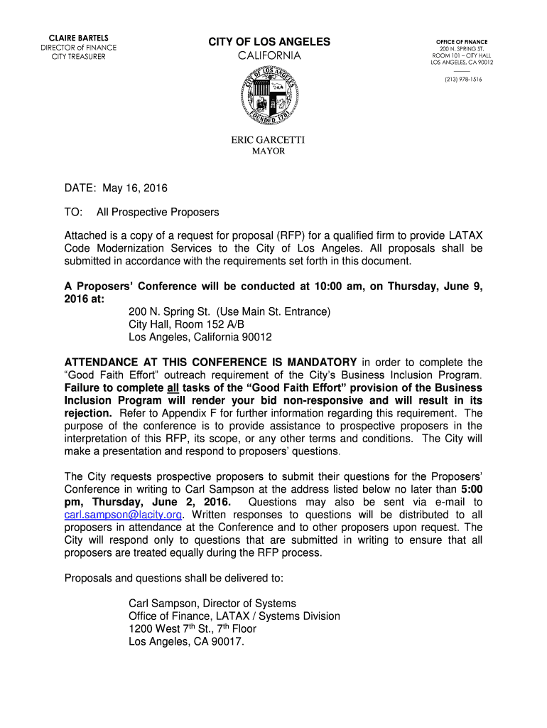 CLAIRE BARTELSCITY OF LOS ANGELES CALIFORNIADIRECTOR of FINANCE CITY TREASUREROFFICE OF FINANCE 200 N. SPRING ST. ROOM 101 CITY HALL LOS ANGELES, CA 90012 (213) 9781516ERIC GARRETT MANDATE: May 16,