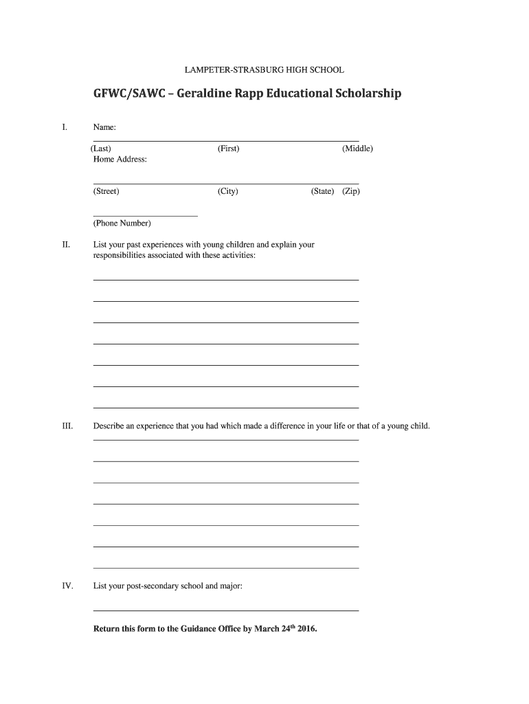 LAMPETERSTRASBURG HIGH SCHOOLGIRL/SAW Geraldine Rap Educational Scholarship I. Name: (Last) (First) (Middle) Home Address: (Street) (City) (State) (Zip) (Phone Number)II. List your experiences with