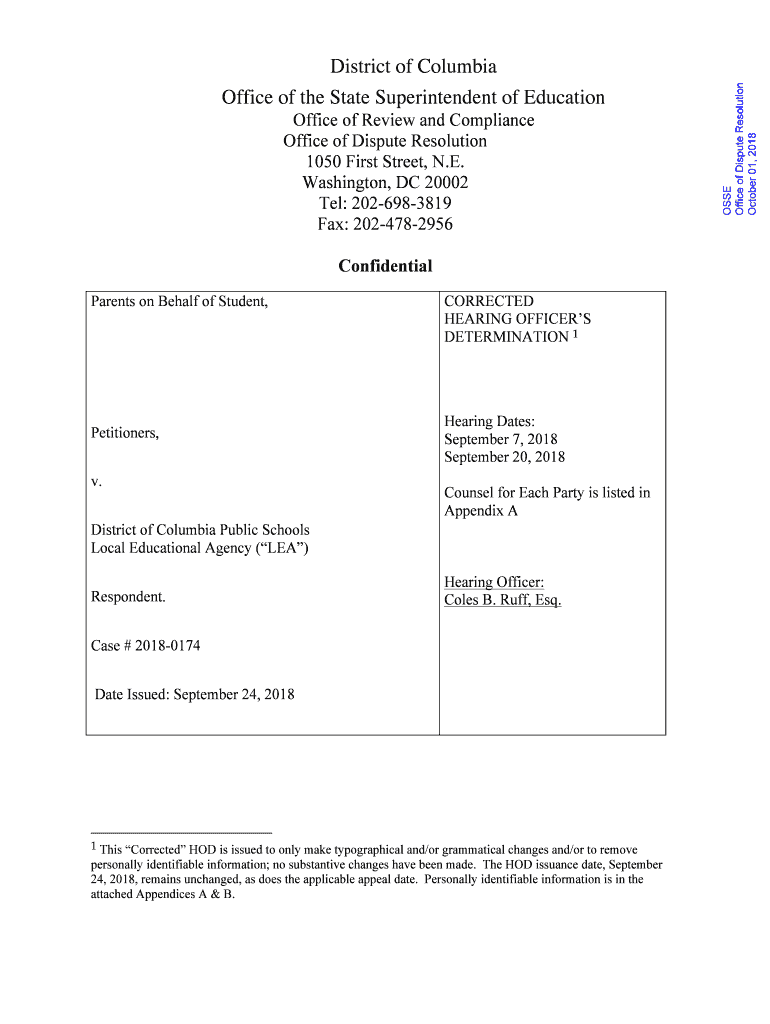 Get the free HEARING OFFICER DETERMINATION - osse dc