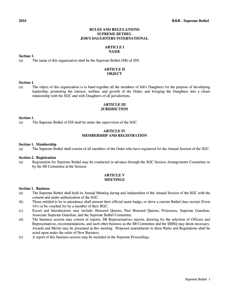 2016R&R Supreme Ethel RULES AND REGULATIONS SUPREME ETHEL JOB IS DAUGHTERS INTERNATIONAL ARTICLE I Resection 1. (a) The name of this organization shall be the Supreme Ethel (SB) of JD. ARTICLE II