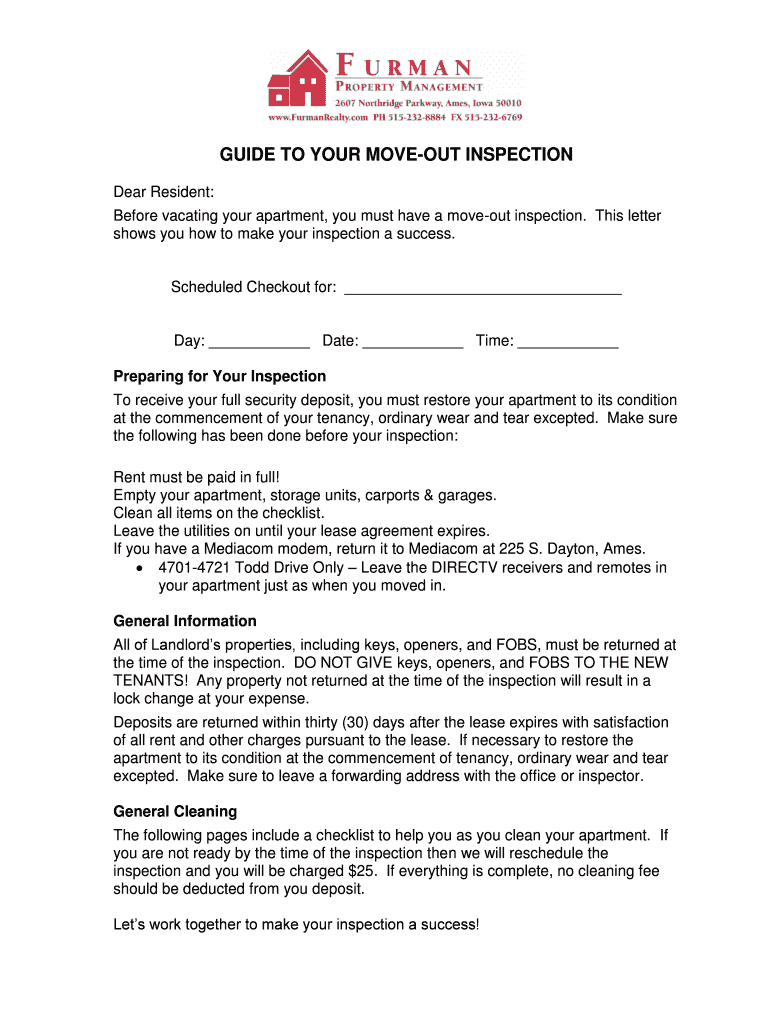 GUIDE TO YOUR MOVE INSPECTION Dear Resident: Before vacating your apartment, you must have a move out inspection. This letter shows you how to make your inspection a success. Scheduled Checkout for: