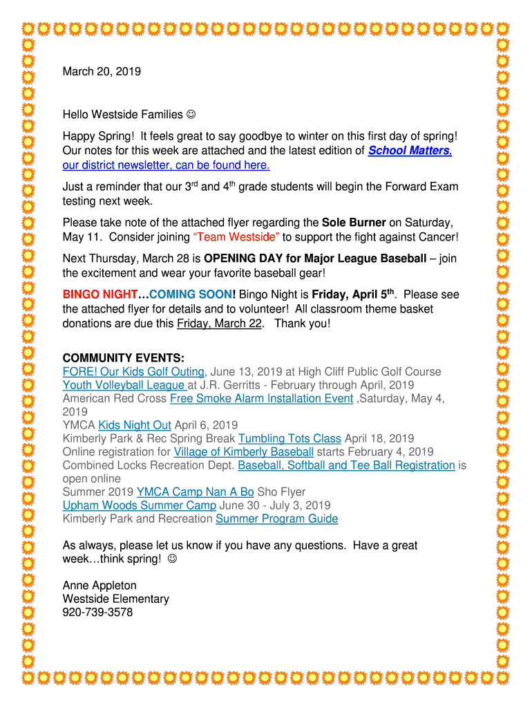 March 20, 2019Hello Westside Families Happy Spring! It feels great to say goodbye to winter on this first day of spring! Our notes for this week are attached and the latest edition of School Matters,