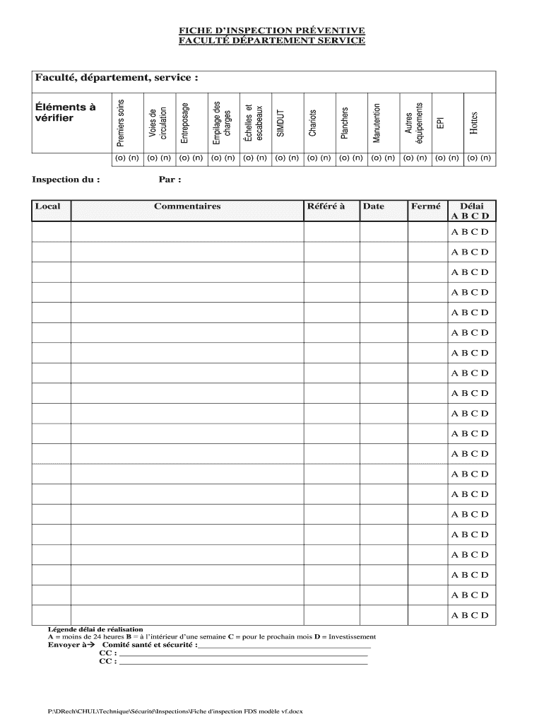 FICHE INSPECTION PREVENTIVE FACULTY DEPARTMENT SERVICEHottesEPIAutres quipementsManutentionPlanchersChariotsSIMDUTchelles et escabeauxEmpilage DES chargesEntreposageVoies de circulationlments vrifierPremiers