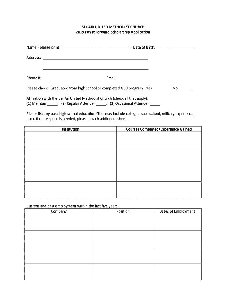 BEL AIR UNITED METHODIST CHURCH 2019 PAY IT FORWARD SCHOLARSHIP GUIDELINES AND APPLICATION The Pay It Forward Scholarship Endowment was established through the generosity of Mr. John E. and Leona