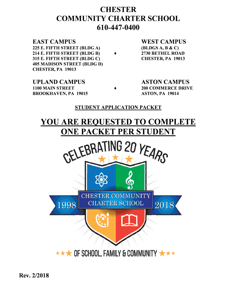 CHESTER COMMUNITY CHARTER SCHOOL 6104470400 EAST CAMPUSES CAMPUS225 E. FIFTH STREET (BLDG A) 214 E. FIFTH STREET (BLDG B) 315 E. FIFTH STREET (BLDG C) 405 MADISON STREET (BLDG D) CHESTER, PA 19013(BLOGS