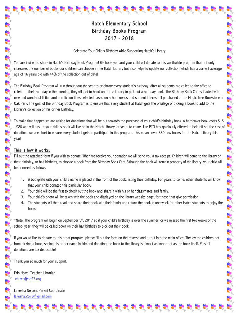 Hatch Elementary School Birthday Books Program 2017 2018 Celebrate Your Child's Birthday While Supporting Hatch's Library You are invited to share in Hatch's Birthday Book Program! We hope you and