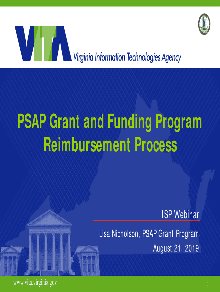 PSA Grant and Funding Program Reimbursement Process ISP Webinar Lisa Nicholson, PSA Grant Program August 21, 2019 www.vita.virginia.gov www.vita.virginia.gov1 1Agenda Brief Overview of PSA Grant Program