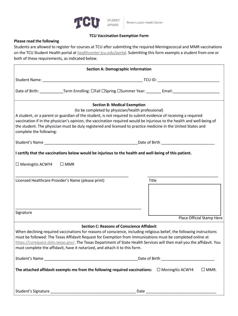 TCU Vaccination Exemption Form Please read the following Students are allowed to register for courses at TCU after submitting the required Meningococcal and MMR vaccinations on the TCU Student Health