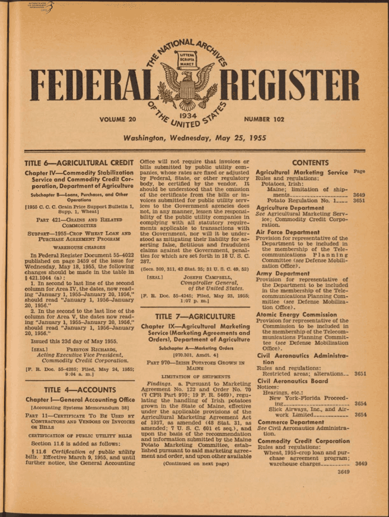 O N A L '1 U FTTB AV 7FEDERALREGISTER E O VOLUME 20NUMBER 102Washington, Wednesday, May 25, 1955TITLE 6 AGRICULTURAL CREDIT Chapter IV Commodity Stabilization Service and Commodity Credit Corp oration,
