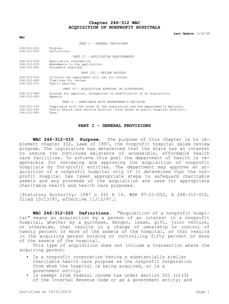 Chapter 246312 WAC ACQUISITION OF NONPROFIT HOSPITALS Last Update: 6/26/98 WAC PART I GENERAL PROVISIONS 246312010 246312020Purpose. Definitions.246312030 246312035 246312040PART II APPLICATION REQUIREMENTS