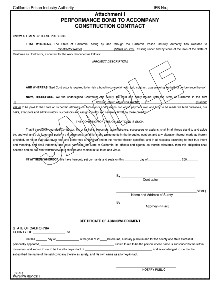 California Prison Industry Authorities No.;Attachment I PERFORMANCE BOND TO ACCOMPANY CONSTRUCTION CONTRACT KNOW ALL MEN BY THESE PRESENTS: THAT WHEREAS, The State of California, acting by and through