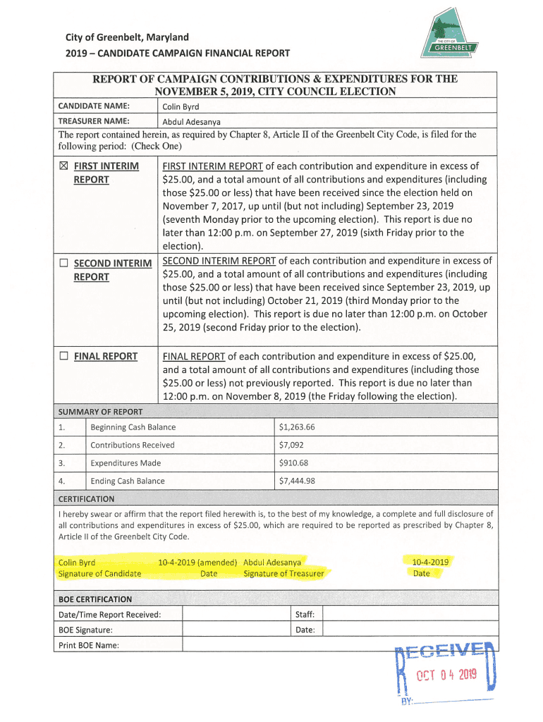 City of Greenbelt, Maryland 2019 CANDIDATE CAMPAIGN FINANCIAL REPORTREPORT OF CAMPAIGN CONTRIBUTIONS & EXPENDITURES FOR THE NOVEMBER 5, 2019, CITY COUNCIL ELECTION CANDIDATE NAME:Cohn ByrdTREASURER